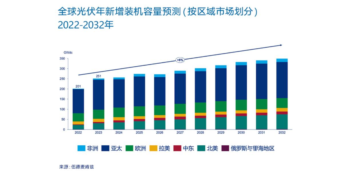 ウッド・マッケンジーは、2022年から2032年にかけて世界の太陽光発電設備の年間平均成長率が6%となり、2028年までに北米がヨーロッパの年間シェアを上回ると予測している。