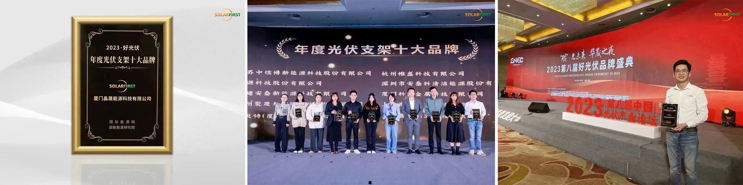2023年11月6日から8日まで、山東省臨沂市で中国(臨沂)新エネルギー高品質発展会議が開催されました。この会議は、中国共産党臨沂市委員会、臨沂市人民政府、国家エネルギー研究所の主催で、中国共産党臨沂嵐山区委員会、臨沂嵐山区人民政府、国際エネルギーネットワークが主催しました。11月7日に開催された2023年中国トップ太陽光発電ブランド賞授賞式において、ソーラーファーストは太陽光発電架台システムにおける卓越した革新的成果が認められ、「2023年太陽光発電架台トップ10ブランド」を受賞しました。