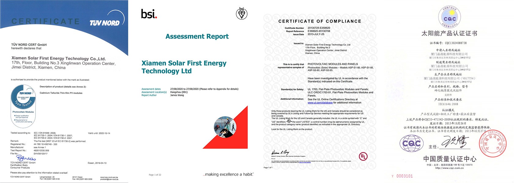 Solar First のテルル化カドミウム (CdTe) 太陽光発電ガラスは、TUV SUD (TUV)、英国規格協会 (BSI)、マイクロ発電製品認証制度 (MCS) などの世界的に有名な機関によって認証されています。