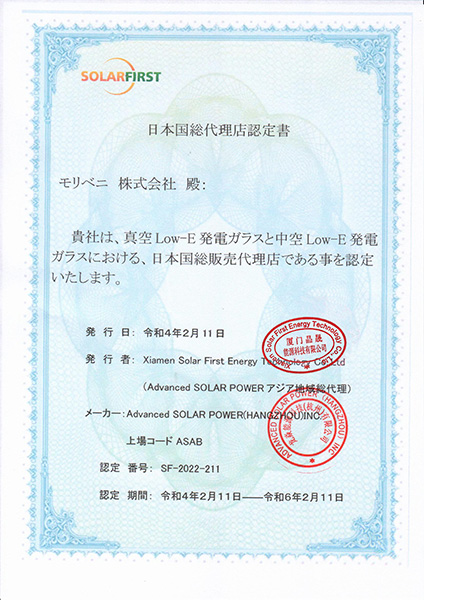 2022年2月11日、ソーラーファーストは有名な日本企業と独占代理店契約を締結しました。 モリベニ株式会社, 同社を日本における総代理店として認可する。