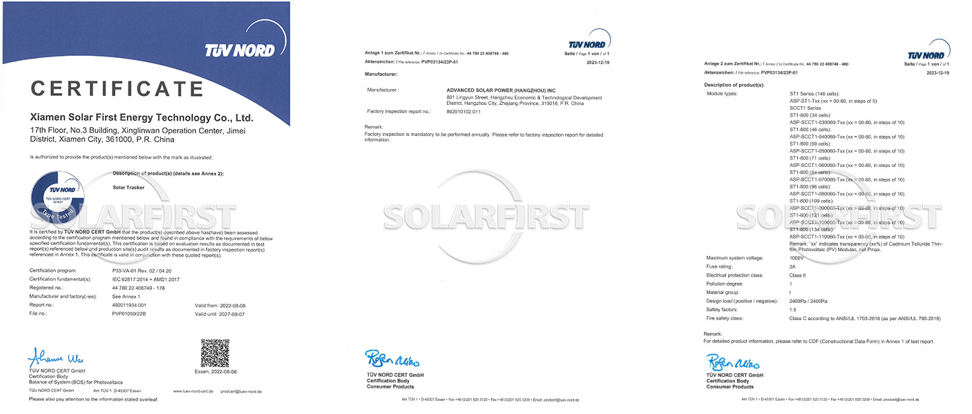 2022年8月初旬、ソーラーファーストグループが独自に開発したHorizon S-1VおよびHorizon D-2V追尾システムは、TÜV North Germanyによる認証試験に合格し、IEC 62817認証を取得しました。このマイルストーンは、ソーラーファーストの追尾製品の国際市場への進出を加速させるとともに、世界的に権威ある認証機関による安定性と信頼性の実証となります。
