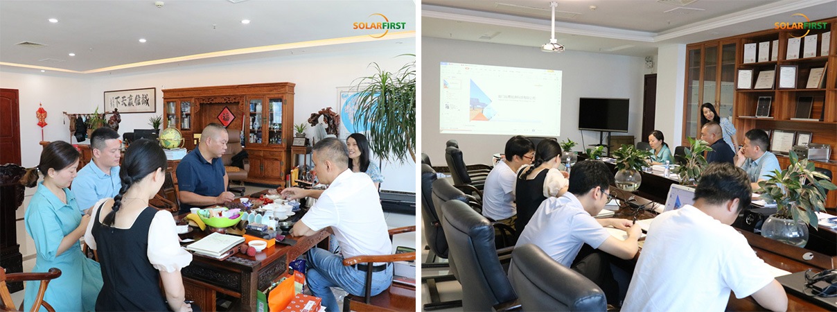 2022年7月21日、信義玻璃工程(東莞)有限公司(以下「信義玻璃」)の幹部一行がソーラーファーストグループを訪問しました。代表団は、廖江紅副社長、李子軒副総経理、周正華営業部長で構成され、ソーラーファーストグループの葉松平社長と周平専務理事の接待を受け、建材一体型太陽光発電(BIPV)製品の研究開発に関する協力支援について協議しました。