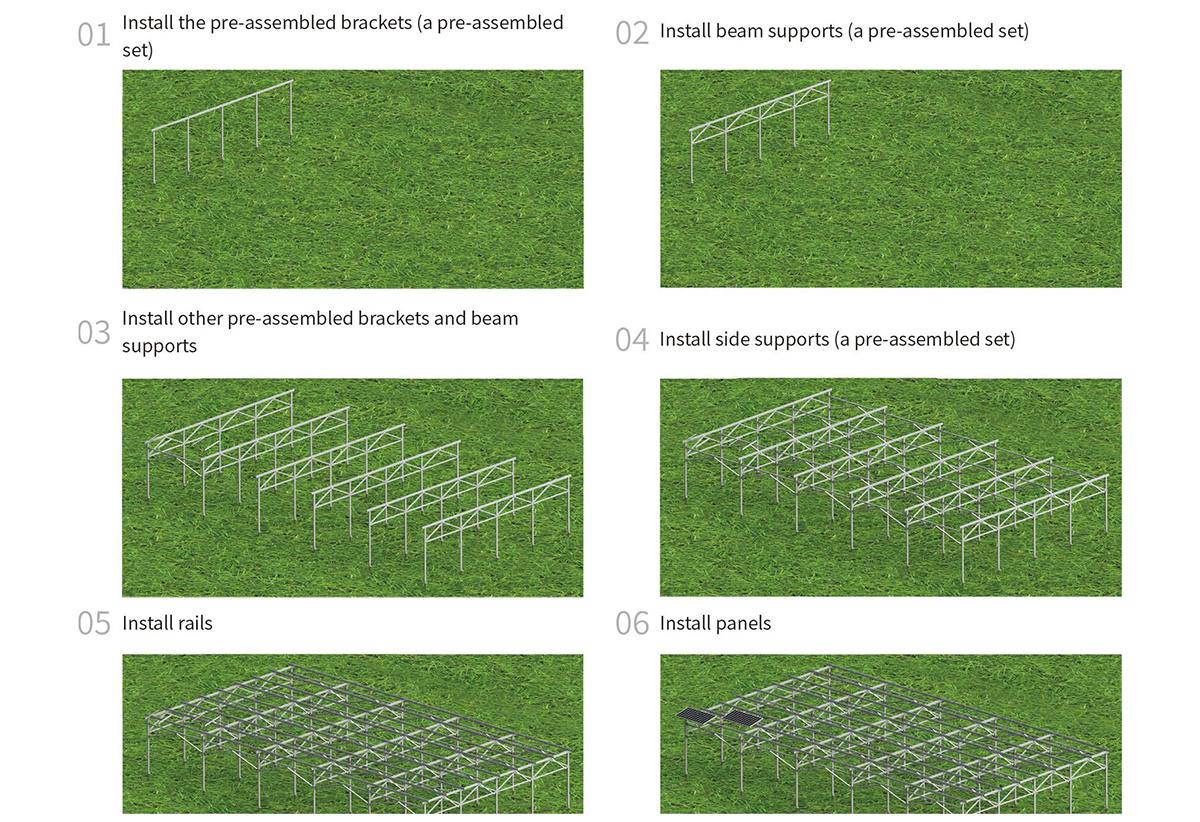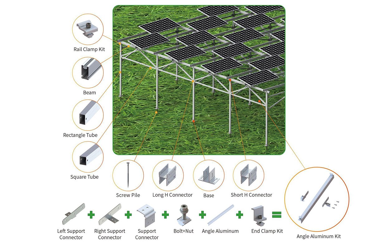 高強度アルマイト処理アルミニウムAL6005-T5とステンレス鋼SUS304を組み合わせたこのシステムは、優れた耐腐食性と構造信頼性を備え、最大60m/sの風荷重と最大1.4kN/m²の積雪荷重に耐えることができます。スクリューパイルまたはコンクリート基礎のオプションから選択でき、設置が簡単で費用対効果に優れています。
