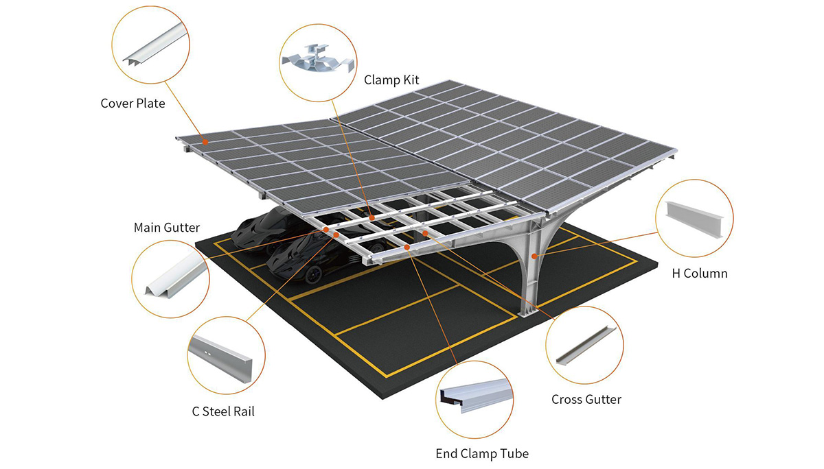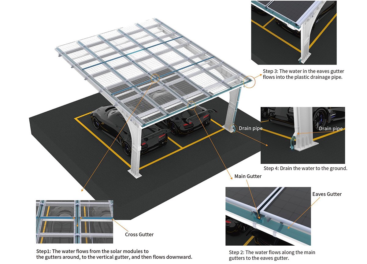 片持ち式スチールカーポートは、独自の防水設計を採用し、一体型の排水カッター、パイプ、溝を通して太陽光モジュール間の隙間から雨水を効率的に排出します。接着剤やゴム製の充填材に頼ることなく、確実な耐候性を確保します。汎用性の高い片持ち式構造は、斜め駐車と直線駐車の両方のレイアウトにシームレスに適応し、スペースの有効活用と車両のカバー範囲を最大化します。