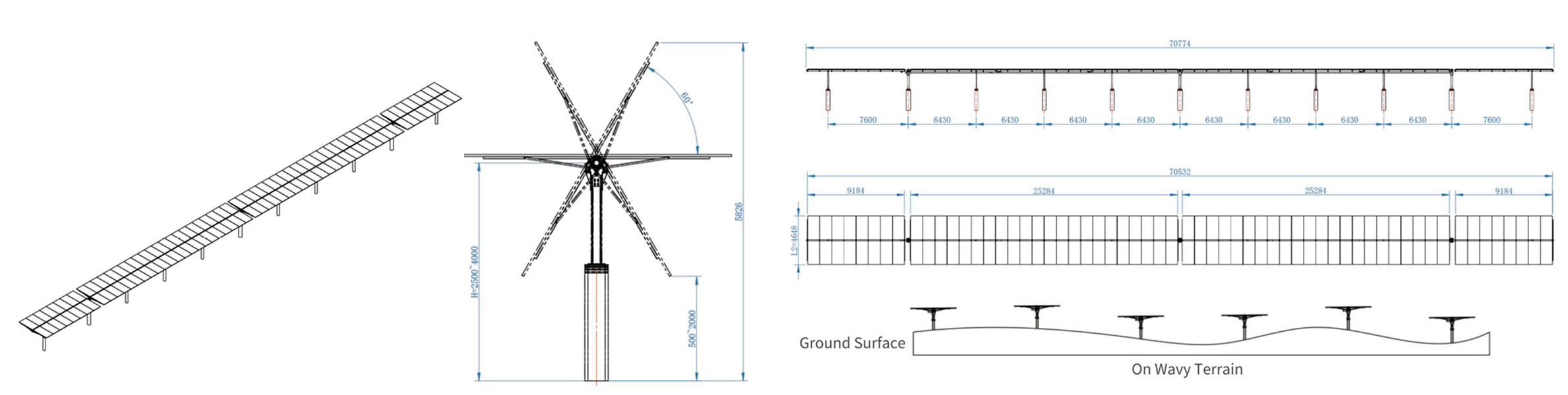 南北方向に最大15%の勾配適応性を備え、不整地でも安定した性能を発揮します。マルチポイント駆動システムにより、風圧ねじれ耐性が大幅に向上し、限界風速耐性も向上。最大45m/sの風下でも安定した動作を実現します。182mmセルと210mmセルの太陽光モジュールに対応し、各トラッカーは最大120枚のモジュールを搭載可能で、システム電圧は1000Vまたは1500Vに設定可能です。