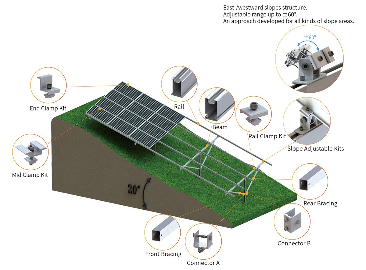あらかじめ設計された調整可能な取り付けポイントにより、設置時に微調整が可能で、地形やモジュールレイアウトの変化にも対応できます。この傾斜支持型太陽光発電システムマウントは、構造的な柔軟性と、安全で信頼性の高い性能を両立しています。