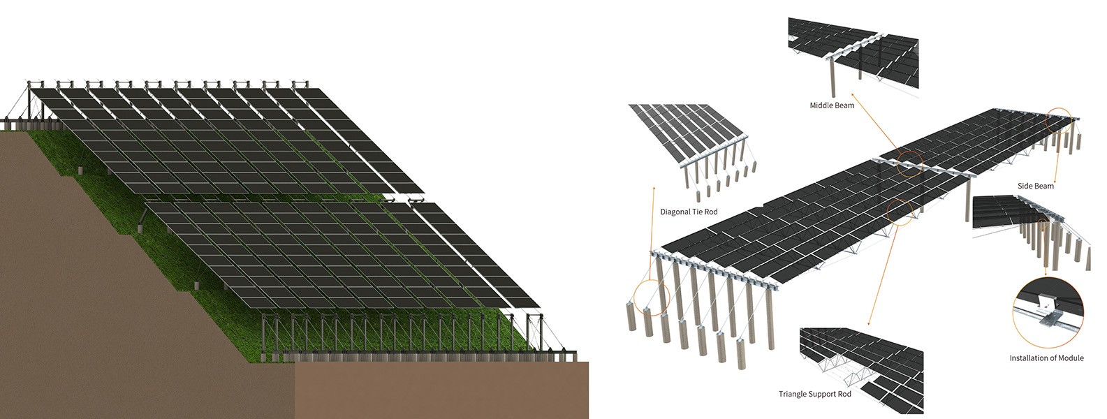 二層ケーブルフレキシブル支持システムは、空間ケーブルネット構造により、画期的な50メートル以下のスパンを実現し、作業クリアランスを6メートル以下に抑えます。固定支持と比較して、杭基礎の使用量を55%削減し、下水処理場、農業用太陽光発電補完施設、漁業用太陽光発電補完施設などの用途に最適で、GB50017-2017鋼構造設計規格にも準拠しています。